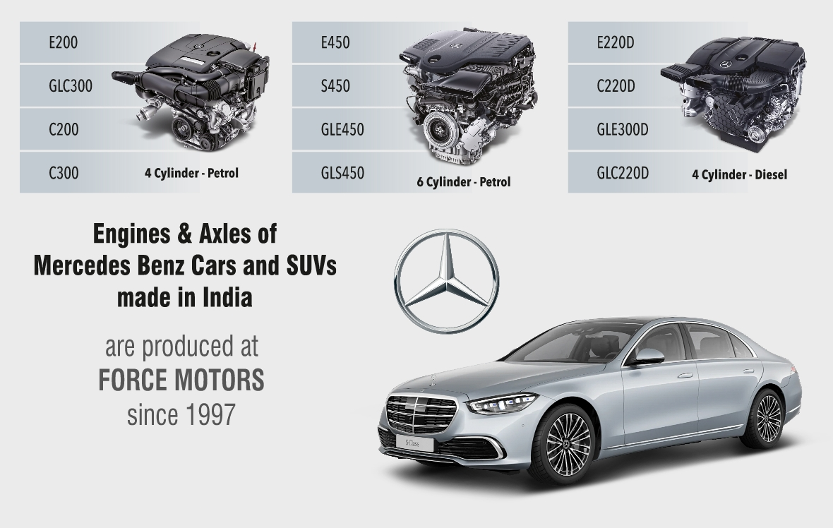 Force Motors has been manufacturing engines and axles for Mercedes-Benz India since 1997 at its dedicated facility in Chakan, Pune. The plant produces 4-cylinder and V6 gasoline and diesel engines, as well as front and rear axles. This long-standing partnership supports the entire range of Mercedes-Benz cars and SUVs made in India, underscoring Force Motors deep expertise in high-performance automotive engineering.